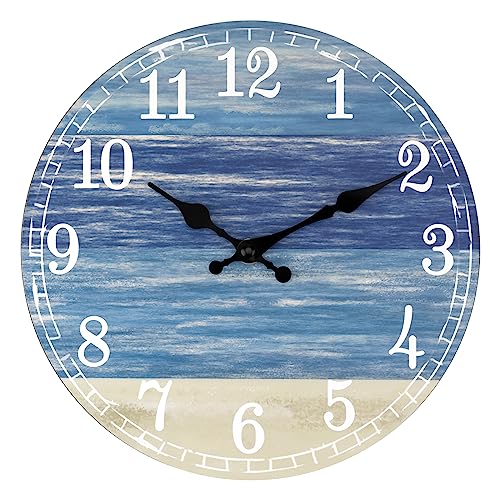 Foxtop Wall Clock - Beach Themed 10 Inch Wall Clocks Battery Operated Silent Non-Ticking Round Vintage Rustic Coastal Wood Wall Clock Decorative for Bedroom Kitchen Living Room Home Office (Blue)Summer Beach Clock: This clock with beach-inspired elements and soothing imagery, this clock is the perfect addition to any coastal-themed decor. Perfect clock for dining rooms, living rooms, family rooms, coffee bar, restaurant.Non Ticking Mechanism: Precise quartz sweep movement guarantees accurate time and completely silent environment.Easy to Read: Wooden blue beachy face clock and large arabic numerals,no frames, no glass and no second hand. It is easy to read from any corner of the room.Easy to Use: Come with 1 hook, wide slot in back for easy hanging. Please use 1 "AA" carbon battery(not included) instead of high duty batteries. Please insert positive(+) side in first.Full Satisfaction Guarantee: If you are not satisfied with this clock for any reason, contact us within 90 days for a full refund or replacement. There's also a 365 day quality guarantee against defective parts.