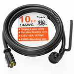 Heavy Duty & Safe: 14/3 extension cord heavy duty 10 feet, 15Amp 125Volt 1875 Watts, SJTW, ETL Listed. 14 AWG has a thicker wire diameter, can carry more power, and has less chance of getting hot, 1875W*1.5 (2812W) overload test, the wire temperature rise is qualified to ensure safety. Black extension cord 10ft suitable for indoor and outdoor, home office use. High quality & practical: High temperature resistance (80?), aging resistance, flame retardant, safe and reliable indoor extension cord, waterproof and anti-corrosion extension cord outdoor. Flat plug & space saving: HUANCHAIN low profile extension cord plug has a 45ø angle S-shaped design to fit into a top wall outlet without blocking the bottom outlet. Black Extension cords with flat plugs are designed for tight spaces, bringing furniture such as sofas, TVs, desks, cabinets, and nightstands closer to the wall without damaging the plug, making better use of corner wall outlets. High Flexible & Durable: High flexible Vinyl 3 prong extension cord and the plug end has a long durable strain relief design, which passes 65000 times great angle bending without break, extending the service life. Each Power Extension Cord 100% passes the 2500V high Voltage test before shipment keep safety in mind. What You Get: 3 years promise outdoor flat extension cord 10 foot, each cord has velcro packing and easy to repack and recycle after use. 24 hours response friendly and reliable customer service. 30-day return and 12-month replacement.
